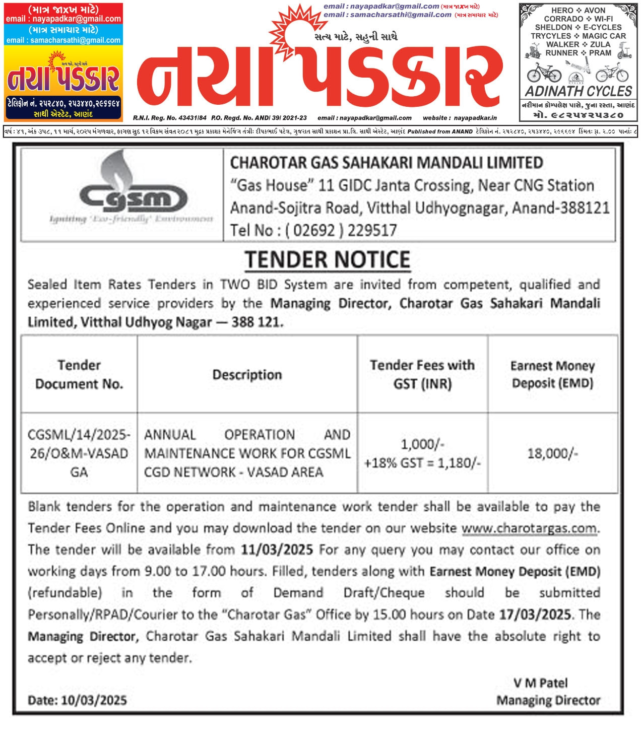 TENDER FOR ANNUAL OPERATION AND MAINTENANCE WORK FOR CGSML CGD NETWORK - VASAD AREA